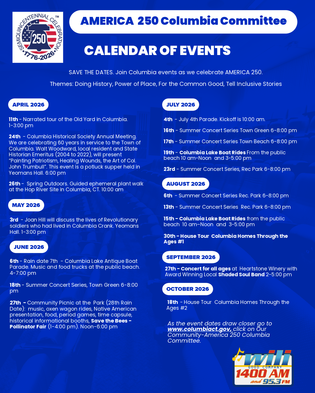 If you would like to participate in volunteering your time for the America 250 Planning Committee, please reach out to the First Selectman’s or Town Administrator’s Office at 860-228- 0110, or townadministrator [at] columbiact.org (townadministrator[at]columbiact[dot]org) or severett [at] columbiact.org (severett[at]columbiact[dot]org).